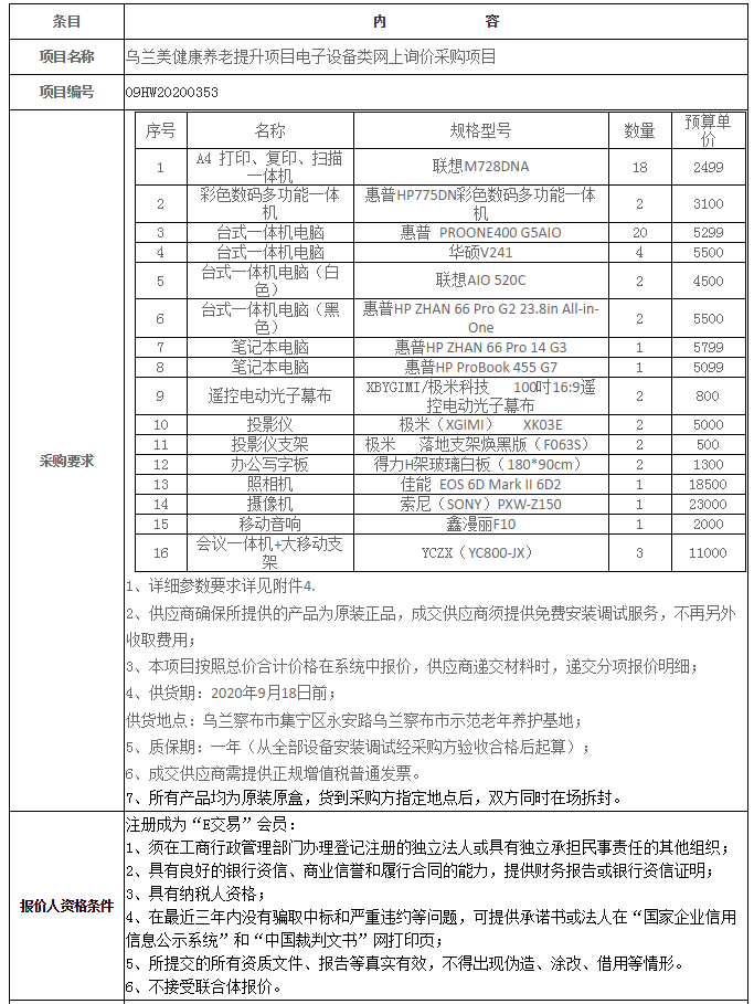 烏蘭美健康養(yǎng)老提升項目電子設(shè)備類網(wǎng)上詢價采購項目發(fā)布時間: 2020-09-01